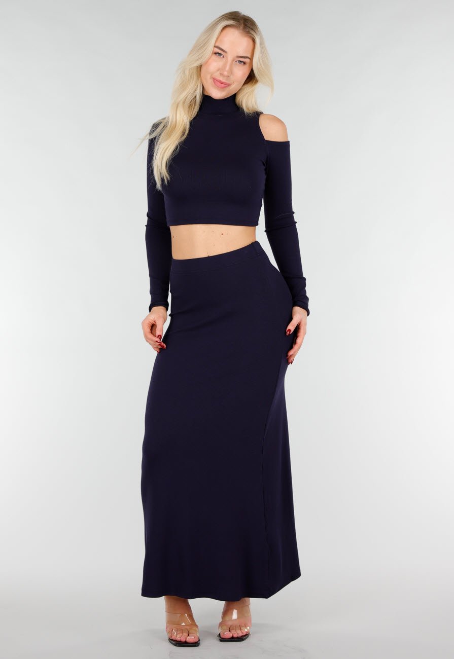 Deze navy two piece set bestaat uit een korte top en een lange rok. De top heeft een col, lange mouwen en een cut out aan één schouder. De pasvorm is aansluitend en eindigt boven de taille. De rok valt lang en heeft een licht uitlopende vorm. Beide items zijn uitgevoerd in een gladde, licht rekbare tricotkwaliteit in een effen donkerblauwe kleur.