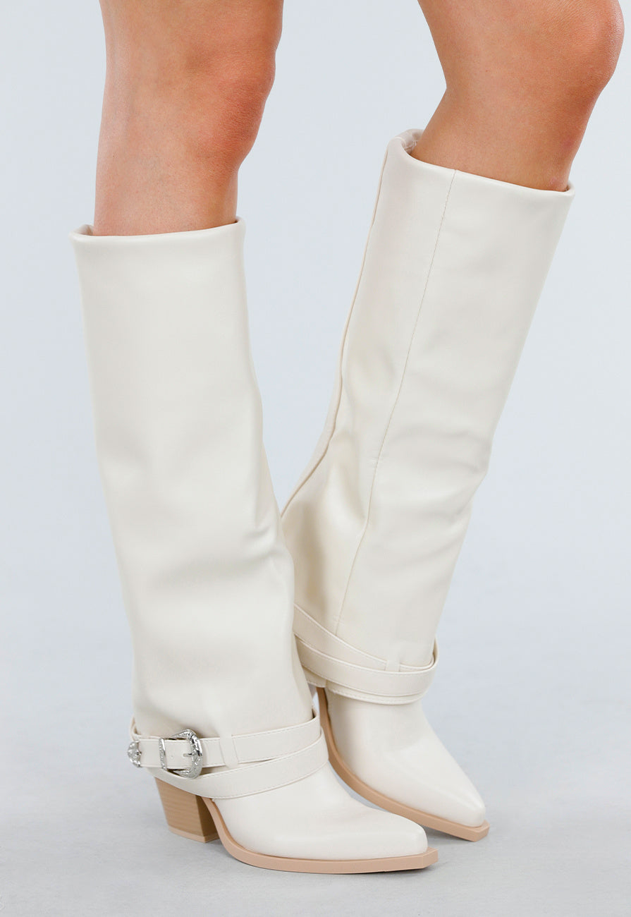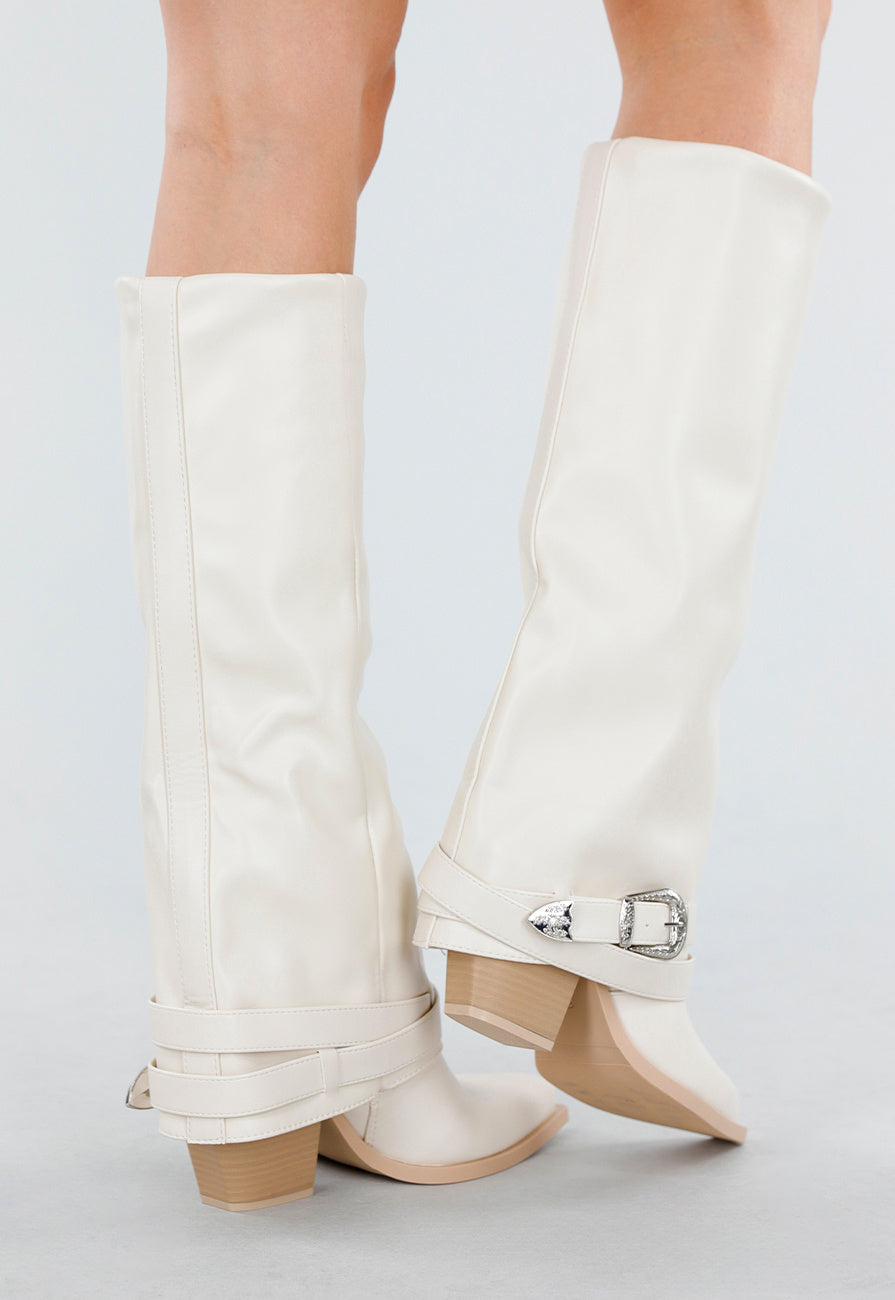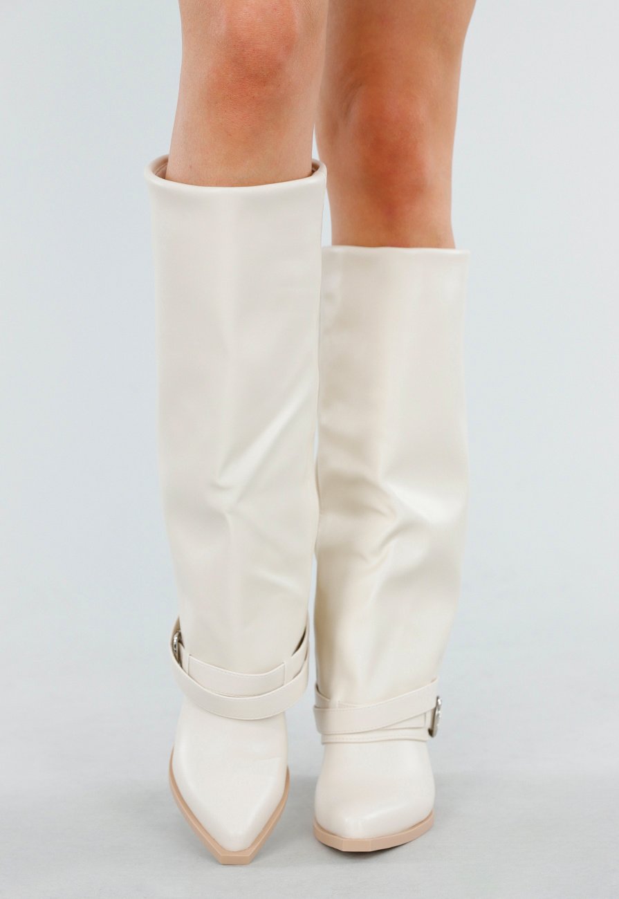 Deze crèmekleurige laarzen reiken tot net onder de knie en hebben een rechte, losse schacht. De puntige neus sluit aan bij de westernstijl, terwijl de brede blokhak in houtlook voor stabiliteit zorgt. Rond de enkel bevindt zich een brede band met een zilverkleurige gesp en decoratieve details. De zool heeft een lichte beige tint die subtiel contrasteert met het off white materiaal. Het oppervlak heeft een gladde lederlook afwerking.