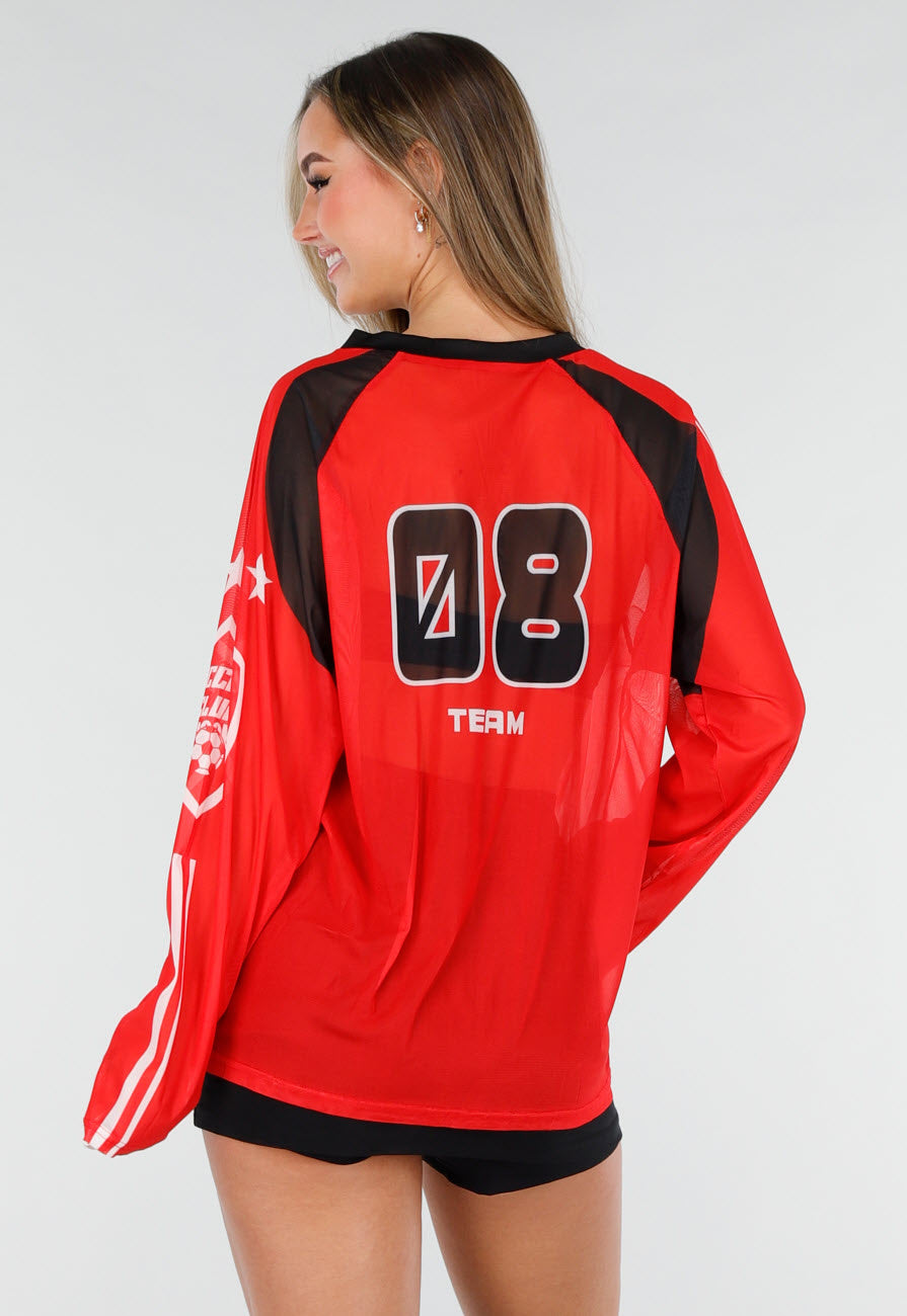Deze top is uitgevoerd in rood mesh materiaal met een licht doorschijnende structuur. Het model heeft een V-hals met zwarte boord, lange mouwen en een rechte, losvallende pasvorm. Op de voorzijde is een contrasterende tekst en een groot numeriek motief aangebracht. De schouders en mouwen zijn deels uitgevoerd in zwart mesh met witte streepdetails. De onderzijde is recht afgewerkt.