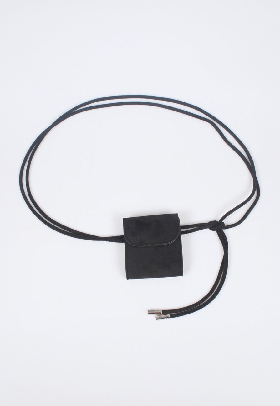 Dit ceintuur is uitgevoerd in een suèdeachtig materiaal en bestaat uit een smalle koordriem met een vast mini pouch. De pouch heeft een rechthoekige vorm en is voorzien van een klep aan de voorzijde. Het ceintuur wordt gesloten door het koord te knopen, waardoor de lengte eenvoudig kan worden aangepast. De volledige lengte van de riem bedraagt circa 250 cm en kan naar wens meerdere keren omgeslagen en gestrikt worden. De uiteinden van het koord zijn afgewerkt met metalen details.