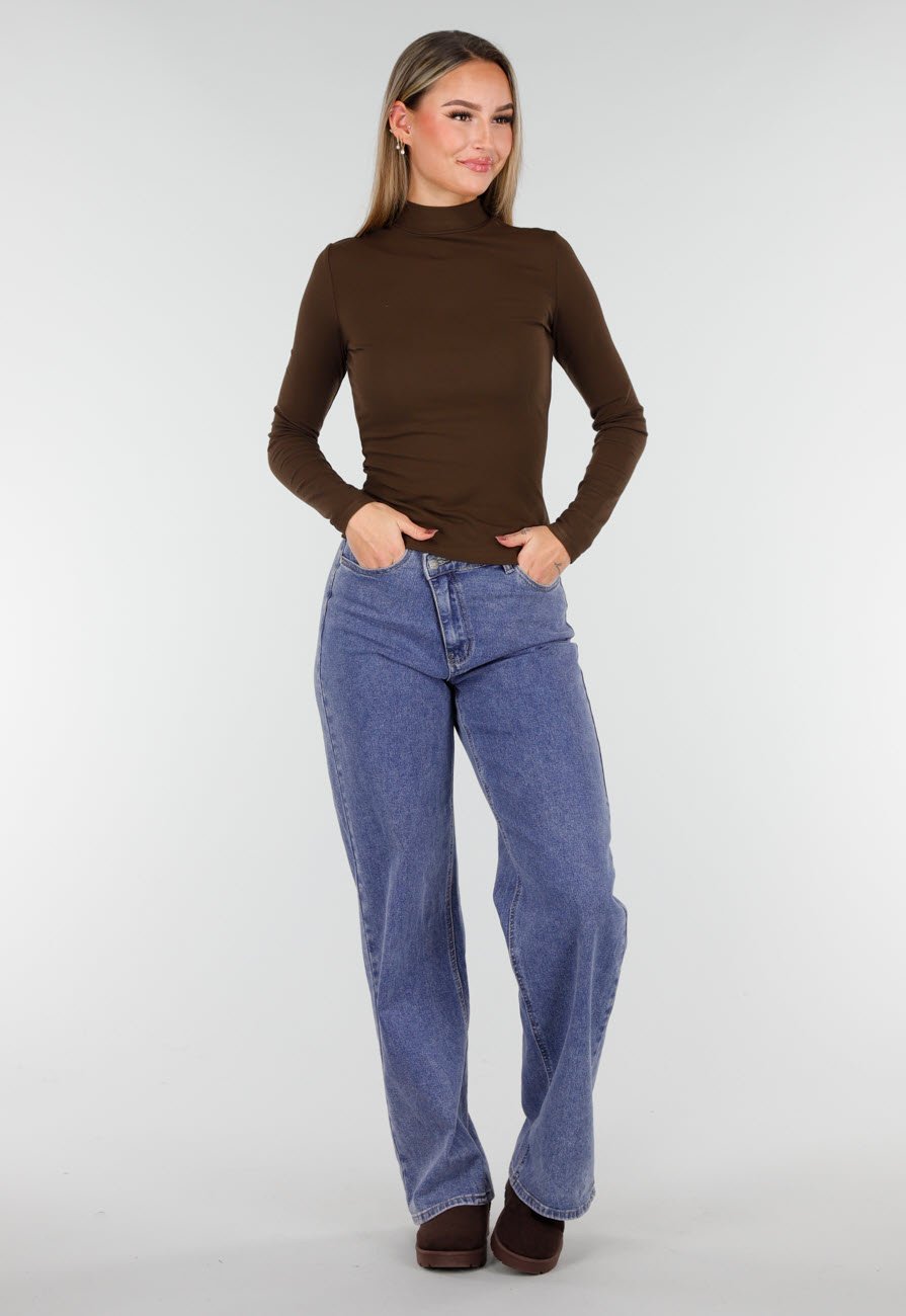 Deze bruine top is gemaakt van een zachte stretchstof die mooi aansluit op het lichaam. De col en lange mouwen geven het item een elegante en tijdloze uitstraling, ideaal als basislaag of als subtiel stijlvol topje voor iedere dag.