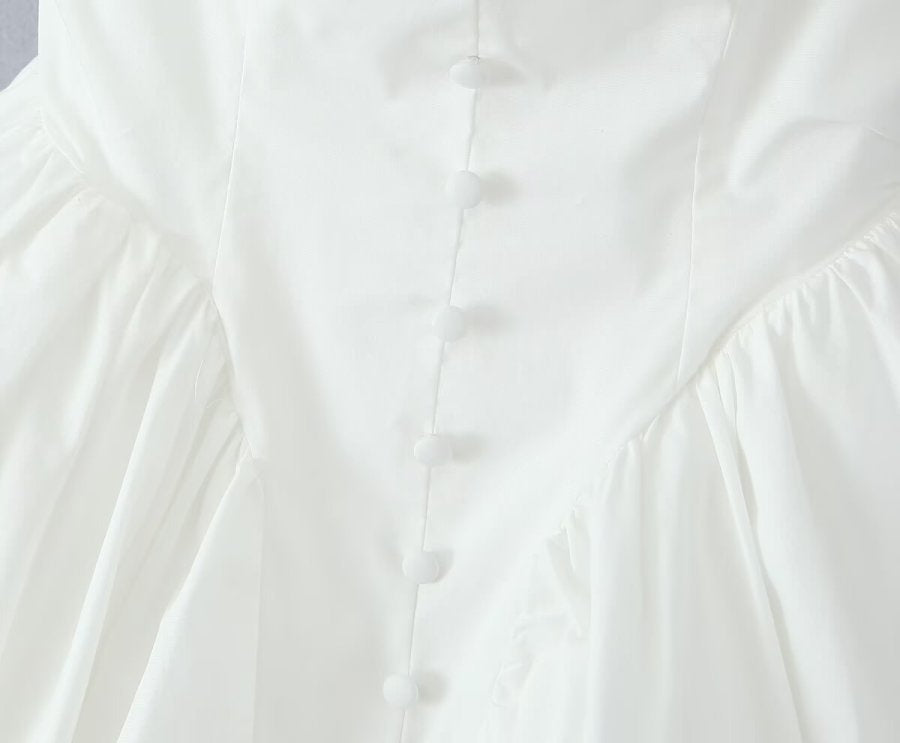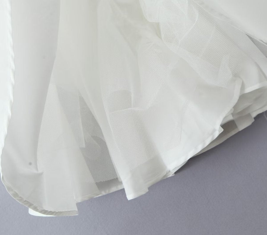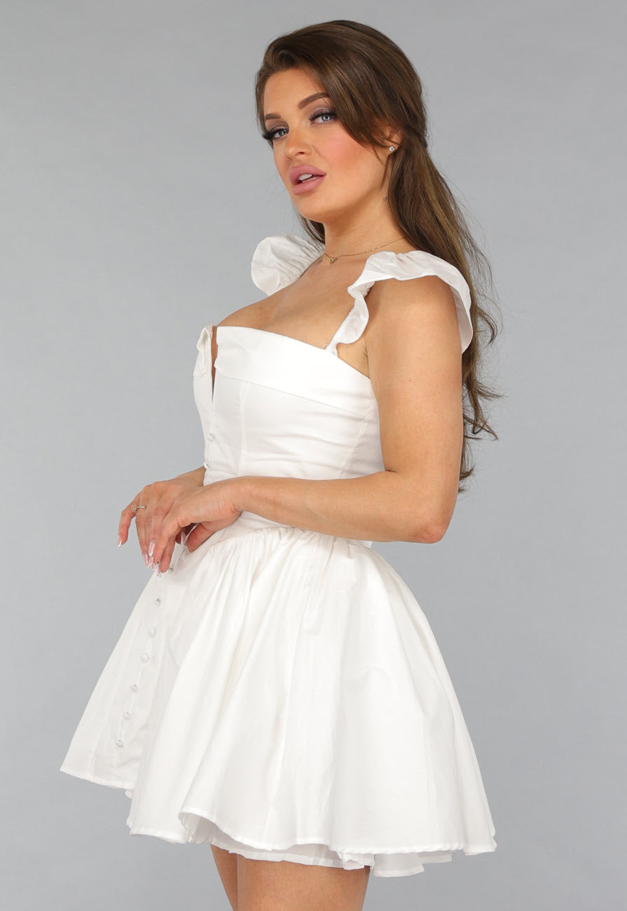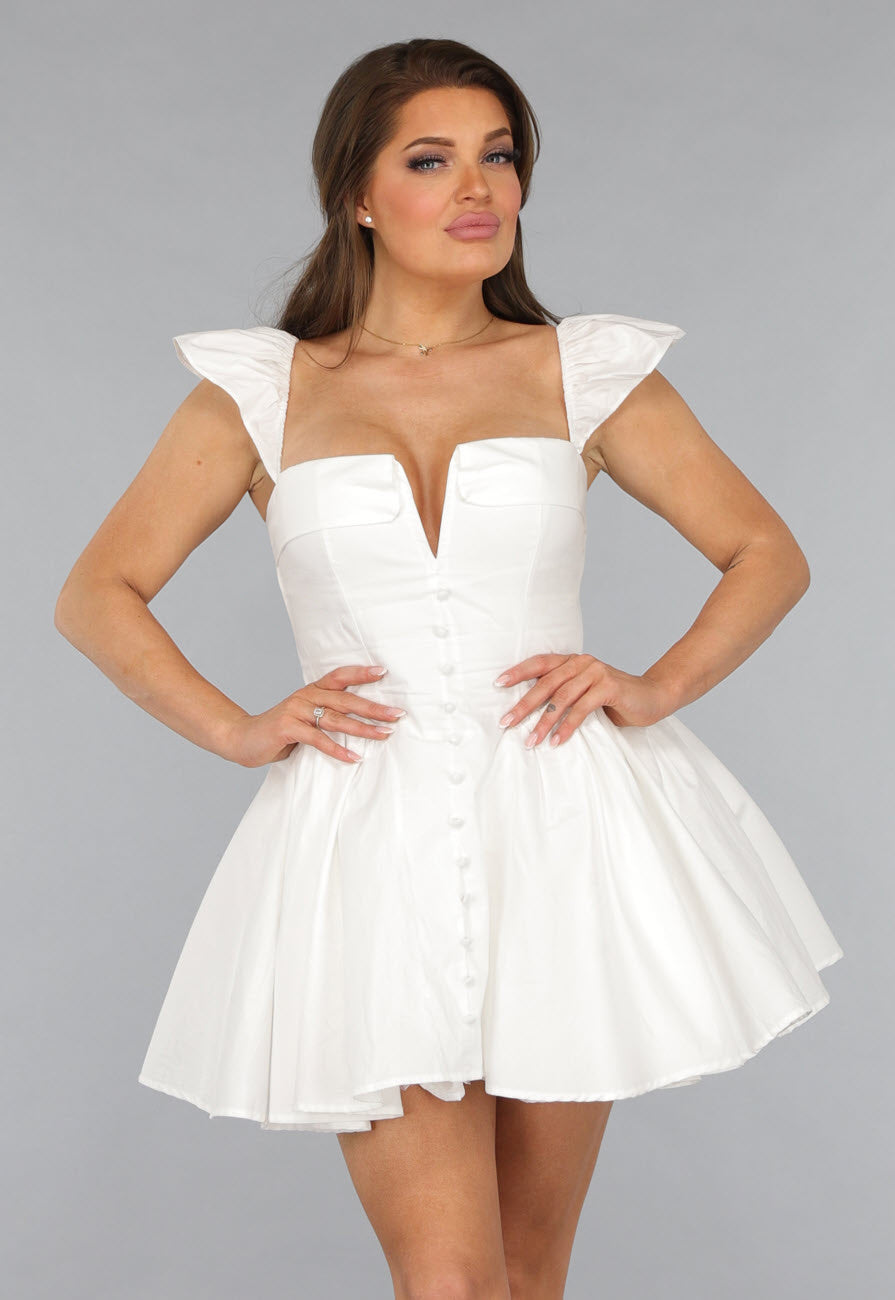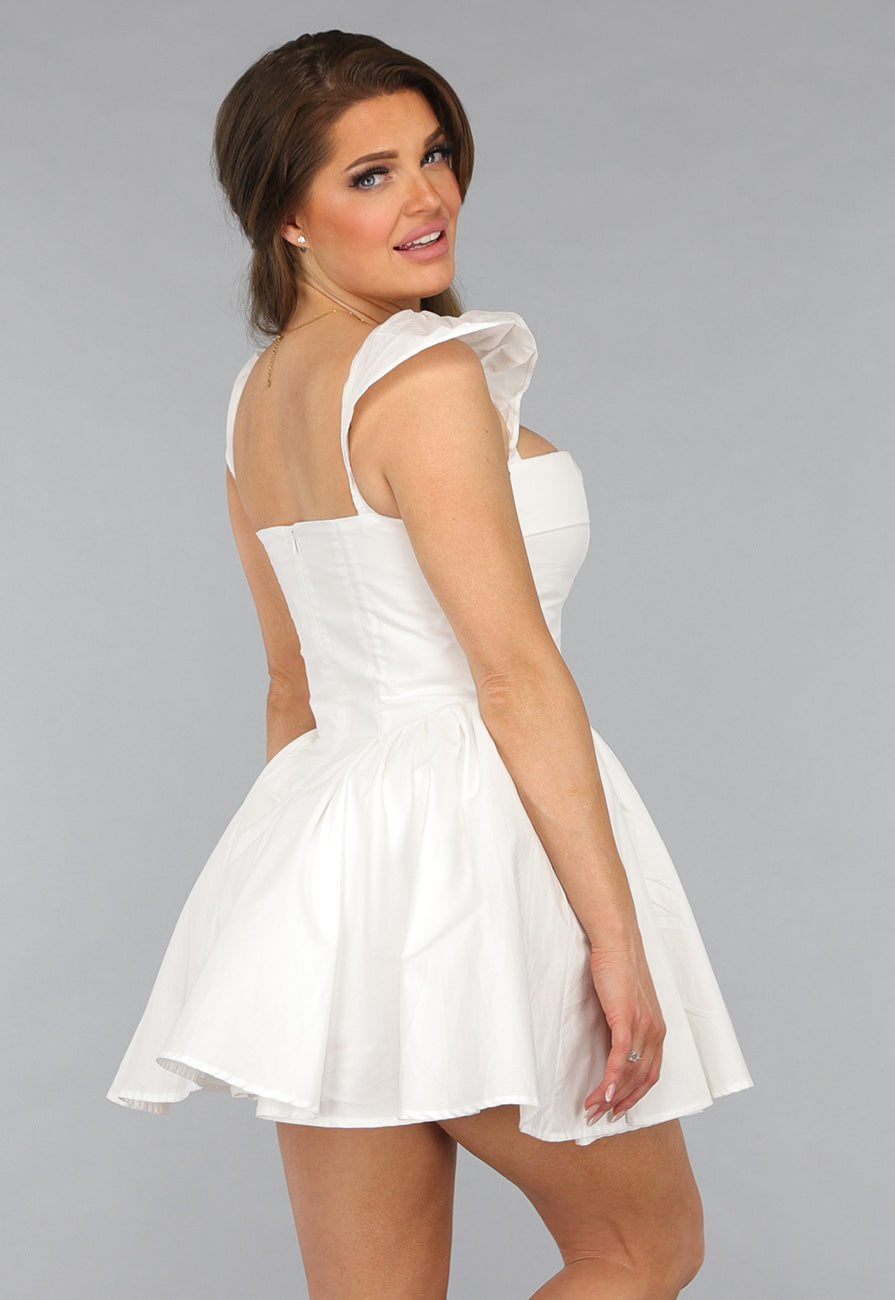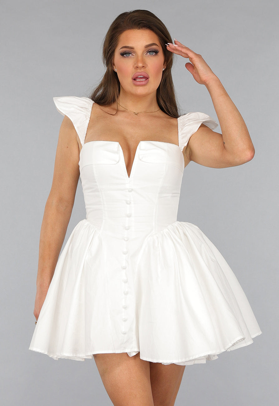 Deze jurk is gemaakt van een effen stevige stof. De top heeft een recht afgesneden hals met een V detail. Het jurkje heeft twee kleine ruffle mouwtjes. Het lijfje is aansluitend en is voorzien van een ritssluiting op de achterkant. De rok van de jurk heeft een skater model en loopt wijd. Het jurkje bevat geen stretch.