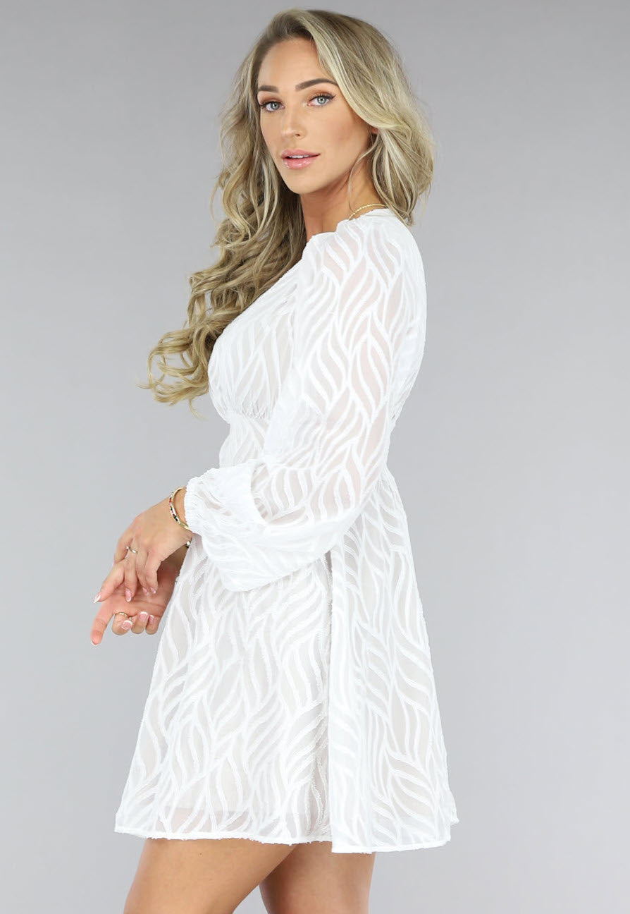 Deze witte jurk heeft een skatermodel en een diepe V-hals met lange mesh mouwen. De jurk is dubbel gevoerd, zodat deze niet doorschijnt. Aan de achterzijde heeft de jurk een ritssluiting. Daarnaast heeft de jurk een patroon van bladeren over de hele jurk. Deze jurk is perfect voor zomerse dagen of een dagje strand!