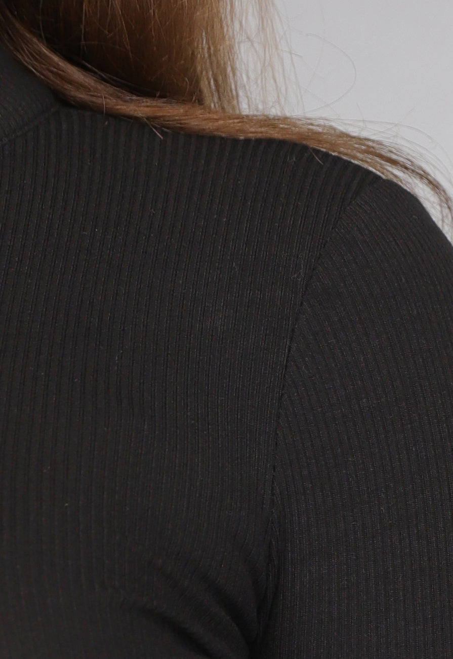 Deze jurk is gemaakt van een fijne stretch ribstof waardoor de jurk gemakkelijk aan en uit te trekken is. De jurk heeft een hoge kraag met een halve ritssluiting en lange mouwen met duimgaten.