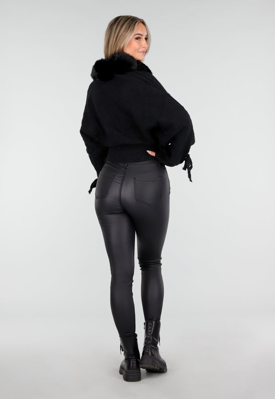 Deze zwarte cardigan is gemaakt van een gebreide stof en afgewerkt met een zachte faux fur kraag. Het korte model heeft lange mouwen met strikdetails aan de boorden en een V-hals. De cardigan sluit met haakjes aan de voorkant.