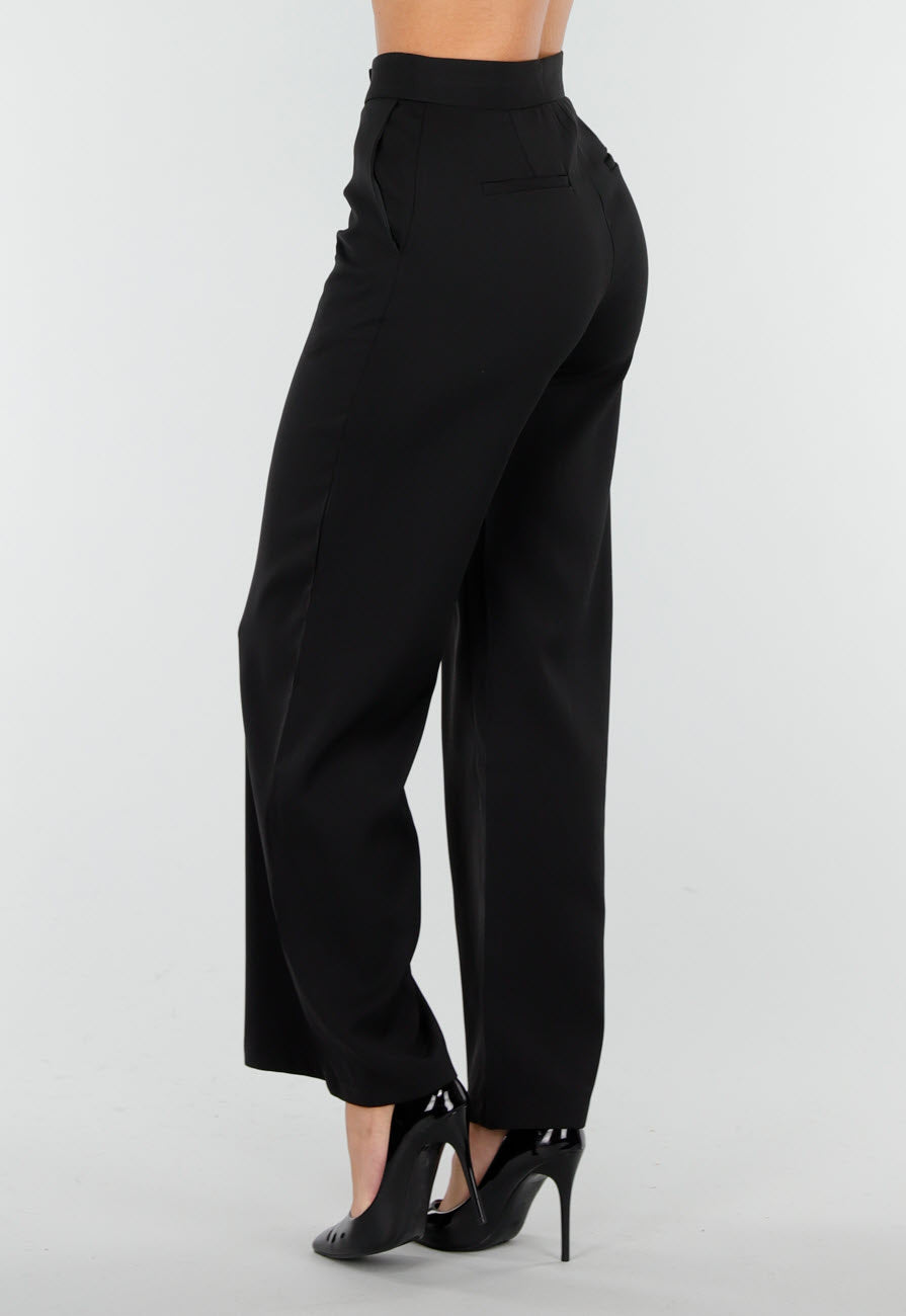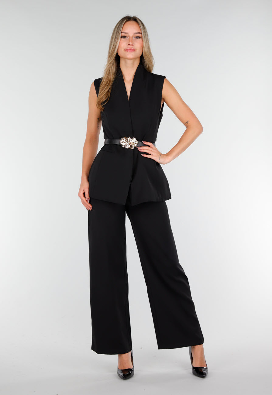 Deze zwarte matchende set bestaat uit een mouwloze top en een bijpassende wide leg broek. In de taille zit een zwarte riem met een grote goudkleurige gesp in organische bloemvorm. Aan beide zijden bevinden zich kleine klepdetails. De broek heeft een hoge, gladde tailleband en rechte wijde pijpen.