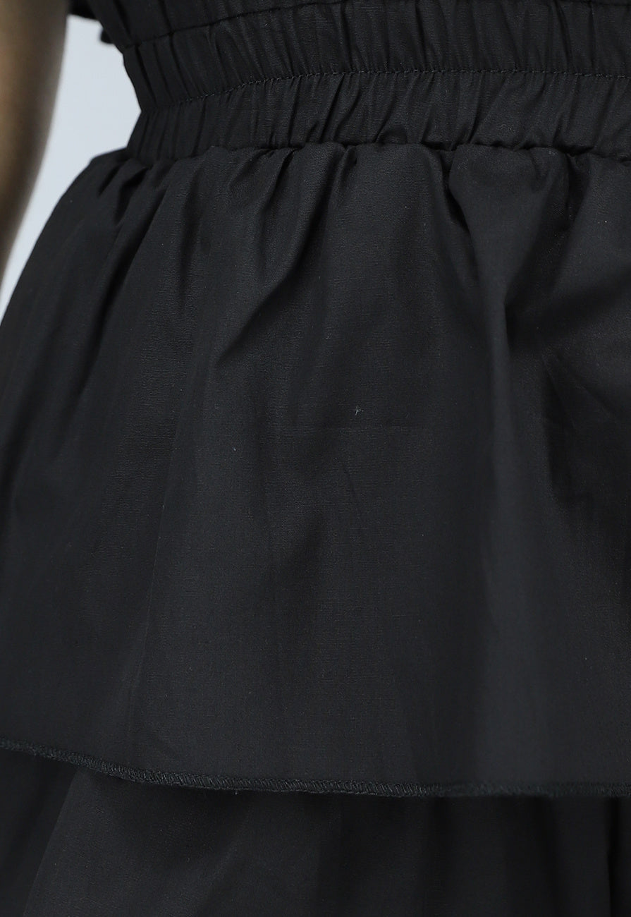 Deze playsuit heeft een geplooid model met ruffle details, wat hem bijna op een jurkje doet lijken. In de taille zit een elatisch detail dat zorgt voor een mooie getailleerde pasvorm. Bovendien heeft hij korte mouwen en een elastische halslijn, waardoor je hem ook off shoulder kunt dragen.