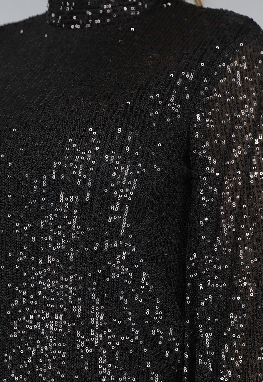 Petite Zwarte Pailletten Jurk met Wijde Mouwen