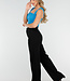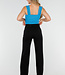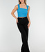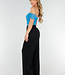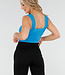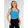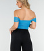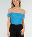 Dieses Oberteil ist aus einem blauen, gefütterten Netzstoff mit viel Stretch. Es kann schulterfrei getragen werden und hat einen plissierten Drapierungseffekt über das gesamte Oberteil. Der Stoff fällt weich und das Top kann entweder mit den Trägern über den Schultern oder schulterfrei getragen werden. Die Farbe ist hellblau und das Material ist leicht transparent.