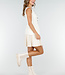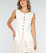 Dieses Oberteil ist aus einem weichen, cremefarbenen Stoff mit leichter Struktur. Es ist ärmellos und wird auf der Vorderseite mit einer Reihe goldener Knöpfe geschlossen. Unten auf der Vorderseite ist ein gerader Mittelschlitz. Dieses Oberteil lässt sich perfekt mit dem passenden Rock kombinieren.