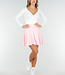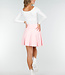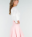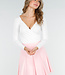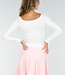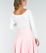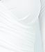 Dieses weiße Oberteil ist aus einem glatten, einfarbigen Stretch-Stoff gefertigt. Das Oberteil hat eine taillierte Passform mit langen Ärmeln und einer leichten Falte auf der Vorderseite. Der Halsausschnitt verläuft diagonal in einer Überlappung. An der Seite sind feine Raffungen eingearbeitet, die den Stoff leicht nach oben ziehen. Das Material ist geschmeidig und dehnt sich gut.