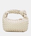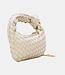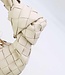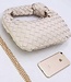 Diese cremefarbene Umhängetasche ist aus geflochtenem Kunstleder gefertigt und hat eine kompakte, abgerundete Form. Der kurze Henkel ist mit einem auffälligen Knopfdetail versehen, während die Oberseite mit einem goldfarbenen Reißverschluss verschlossen wird. Neben dem kurzen Griff verfügt dieses Modell über einen zusätzlichen abnehmbaren langen goldenen Kettengriff, sodass die Tasche auch als Umhängetasche getragen werden kann. Das geflochtene Muster verleiht der Tasche ein strukturiertes Aussehen, während die geschmeidige Verarbeitung für einen modernen Look sorgt.