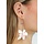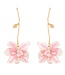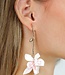 Diese goldfarbenen Ohrringe haben eine längliche Form, die von einem Zweig mit einem dezenten Blattakzent inspiriert ist. Am unteren Ende hängt ein blumenförmiger Anhänger in einer Kombination aus Rosa und Weiß mit leicht glänzender Oberfläche. Die Ohrringe werden mit einem Stecker auf der Rückseite befestigt.