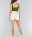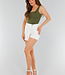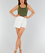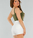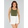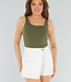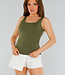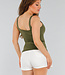 Dieses olivgrüne Oberteil ist vollständig gefüttert, ärmellos und hat sowohl vorne als auch hinten einen geraden Ausschnitt. Der Schnitt ist schmal geschnitten und liegt gut am Körper an. Die Schulterträger sind breit und verlaufen gerade über die Schultern. Der Stoff ist glatt, dehnbar und leicht glänzend. Der Saum fällt auf die Hüfte und ist gerade geschnitten.