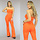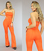 Dieser Anzug besteht aus einem kurzen Bandeau-Top und einer Hose mit hoher Taille. Das Oberteil ist vorne spitz zulaufend und hat einen klobigen Reißverschluss auf der Rückseite. Die Hose hat einen Reißverschluss mit einem einzigen Knopf darüber. Die Beine sind ausgestellt und über die gesamte Länge abgeschnitten. Die Hose hat keine Taschen. Beide Teile sind aus einem dehnbaren Stoff gefertigt und lassen sich auch gut einzeln kombinieren.