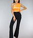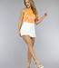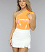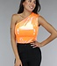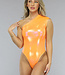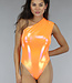 Der orangefarbene holografische Metallic-Body hat eine Schulter und ist in Falten gelegt. Das Unterteil fällt auf halber Höhe zwischen den Pobacken und hat unten einen Druckknopfverschluss, der aus drei Druckknöpfen besteht.