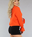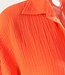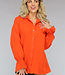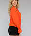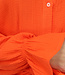 Diese orangefarbene Bluse ist aus einem schönen, weichen Musselinstoff gefertigt. Sie hat außerdem lange Ärmel, die am Ende in einen Trompetenärmel übergehen. Die Bluse hat einen Knopfverschluss, der aus sieben Knöpfen besteht. Die Bluse ist perfekt für den King's Day!