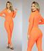 Dieser Overall ist aus dehnbarem Rippstoff gefertigt und hat eine gute Passform. Es hat lange Ärmel und einen Kragen. An der Vorderseite befindet sich ein verdeckter Reißverschluss, mit dem man auch das Dekolleté bestimmen kann. Tragen Sie diesen Jumpsuit mit einem hohen Ausschnitt oder einem tiefen Dekolleté.