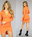Schlüsselwörter: orangefarbenes Bodycon-Kleid, Kleid mit Kragen, Falten, lange Ärmel, langärmelig, V-Ausschnitt, Klappe, asymmetrisch, Gummizug