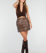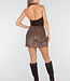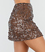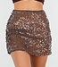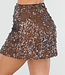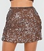 Dieser braune Minirock ist vollständig mit glänzenden Pailletten verziert, die die gesamte Oberfläche bedecken. Das kurze Modell reicht bis über das Knie und hat eine gerade, figurbetonte Silhouette. Die überlappenden Pailletten verleihen dem Rock eine subtile Struktur und sorgen für einen schimmernden Effekt.