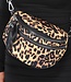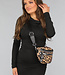 Diese kleine Tasche ist aus einem niedlichen Stoff mit Panther-Print gefertigt. Sie hat ein halbkreisförmiges Design mit einem silberfarbenen Reißverschluss. Auf der Vorderseite hat die Tasche zwei Fächer und in dem großen Fach befindet sich ein zusätzliches Innenfach mit Reißverschluss. Auf der Rückseite der Tasche befindet sich ein weiteres zusätzliches Fach. Die Tasche ist mit einem breiten Riemen ausgestattet, mit dem sie über der Schulter getragen werden kann.