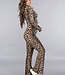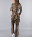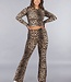 Dieser Zweiteiler ist aus einem Stretch-Stoff gefertigt und mit einem tollen Leopardenprint versehen. Das Oberteil hat lange Ärmel und ist tailliert geschnitten. Außerdem hat es Daumenlöcher am unteren Ende der Ärmel. Die Hose hat eine hohe Taille und ausgestellte Beine. Auf der Rückseite hat die Hose einen Knittereffekt.