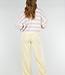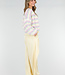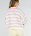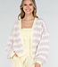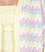 Diese Strickjacke ist in einer Pastellfarbkombination aus Hellgelb, Rosa, Lila, Blau und Weiß in einem eingewebten Muster gehalten. Das Modell hat eine offene Vorderseite ohne Verschluss und ist mit gerippten Bündchen an Hals, Ärmeln und Saum versehen. Die langen Ärmel haben eine leicht voluminöse Form und schließen mit breiten Manschetten ab. Die Strickjacke hat eine gerade, leicht oversized Passform.