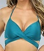Dieses Bikinioberteil ist petrolfarben und aus einem glatten, schimmernden Stoff gefertigt. Das Top ist vorgeformt und hat einen kleinen Push-up. Das Oberteil hat einen Neckholder, der im Nacken zu binden ist, und einen Hakenverschluss auf der Rückseite. Von der Brust aus verlaufen zwei Träger unter der Brust bis zum Rücken, wo man sie zusammenbinden muss. Dies ist eine Art Überlappung.