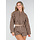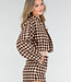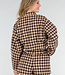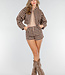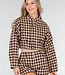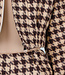 Dieses 2-teilige Set besteht aus einer kurzen Hose und einer passenden Jacke mit Reißverschluss und Knopfverschluss. Beide Teile sind aus einem robusten Gewebe mit braunem Hahnentrittmuster gefertigt. Die Jacke hat lange Ärmel mit abgesenkten Schultern und einen hohen Kragen. Die Hose hat einen hohen Bund, Gürtelschlaufen, einen verdeckten Reißverschluss und zwei Eingrifftaschen vorne und ist an der Unterseite leicht ausgestellt. Der Stoff fühlt sich robust an und ist leicht strukturiert.