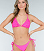Diese Bikinihose ist aus einem einfarbigen rosa Stretchstoff gefertigt und hat einen tiefen Ausschnitt. Das Modell ist an beiden Seiten mit verstellbaren Schnürverschlüssen versehen, sodass die Taillenweite leicht angepasst werden kann. Die Hose ist vollständig gefüttert und schmiegt sich glatt an den Körper an.