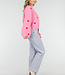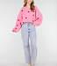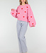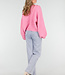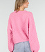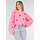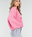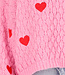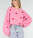 Dieser rosa Pullover hat ein grob gestricktes Muster und einen Rundhalsausschnitt. Die langen Ballonärmel und die gerade Passform verleihen dem Pullover eine lockere Silhouette. Auf der Vorderseite befinden sich mehrere rosa Herzapplikationen, die einen Kontrast bilden. Die Ärmelbündchen und der Saum sind mit gerippten Strickbündchen versehen.
