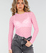 Dieser Body ist aus einem rosa, transparenten Mesh-Stoff mit einem gleichmäßig eingewebten Muster gefertigt. Das Modell hat lange Ärmel und einen runden Ausschnitt mit schmalem Abschluss. Der Body liegt eng am Körper an und hat eine anschmiegsame Passform. Der untere Teil ist als Body mit glattem Abschluss gefertigt, wodurch das Ganze straff und gleichmäßig sitzt.