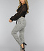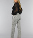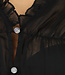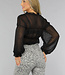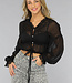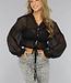 Diese schwarze Bluse ist aus einem durchscheinenden Stoff gefertigt. Sie hat lange Puffärmel und mehrere Falten und Rüschen. Die Bluse hat drei Knöpfe, die auch einen V-Ausschnitt bilden.