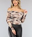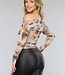 Dieses Oberteil ist aus einem bequemen und leichten Netzmaterial gefertigt. Das Oberteil hat lange Ärmel und verfügt über einen Druck auf dem gesamten Shirt. Das Top ist schulterfrei geschnitten und hat Plissee-Details an der Taille.