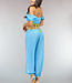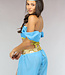 Die Hose hat einen elastischen Bund mit einem Reißverschluss auf der Rückseite. Im Inneren der Hose befindet sich eine lockere Hose. An beiden Seiten der Hose befindet sich ein großer Schlitz. Das Oberteil hat ein schulterfreies Design und einen blinden Reißverschluss an der Seite. Außerdem ist es mit goldfarbenen, bestickten Borten versehen.