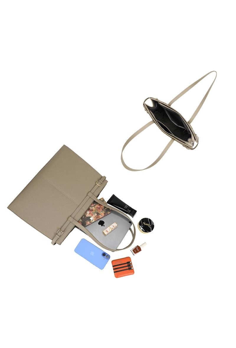 Diese beigefarbene Shopper-Tasche ist aus einem strukturierten Material in Lederoptik gefertigt und hat ein geräumiges, rechteckiges Design. Die Tasche verfügt über zwei lange Schulterriemen, sodass sie bequem über der Schulter getragen werden kann. An der Oberseite ist die Tasche mit einem schmalen Band mit goldfarbenen Schnallenverschlüssen als Detail versehen, während die Rückseite ein Reißverschlussfach für zusätzlichen Stauraum bietet. Der Boden ist verstärkt und mit vier goldfarbenen Schutzknöpfen versehen. Mit den sauberen vertikalen Nähten und klaren Linien ist dies eine praktische Tasche mit einem gepflegten Aussehen.