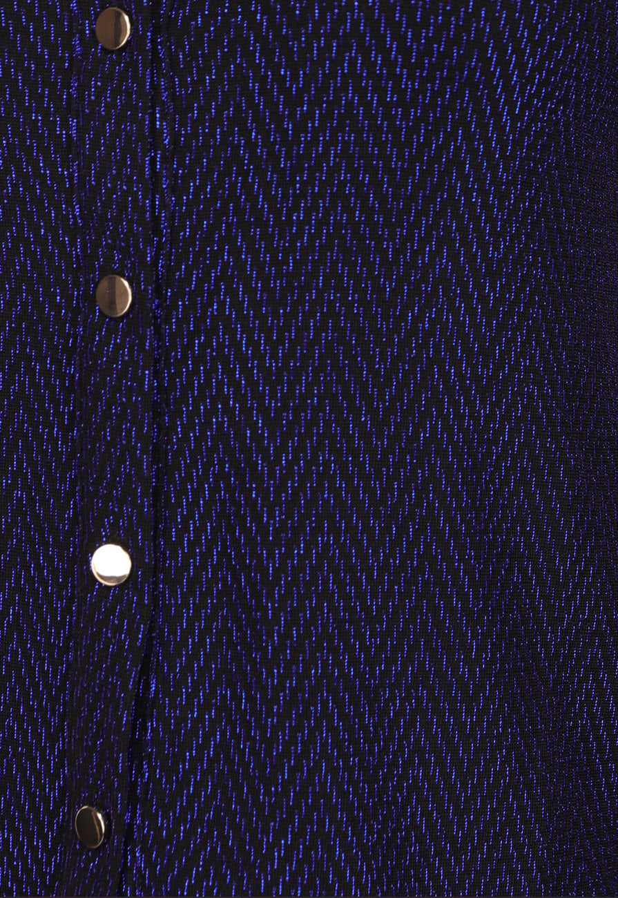 Diese Bluse ist aus einem feinen Stretch-Stoff gefertigt. Sie hat lange Ärmel und einen Kragen. Auf der Vorderseite befindet sich ein Knopfverschluss, der aus sechs goldenen Knöpfen besteht. Der Stoff des Oberteils ist mit einem glitzernden Zickzack-Muster verziert.