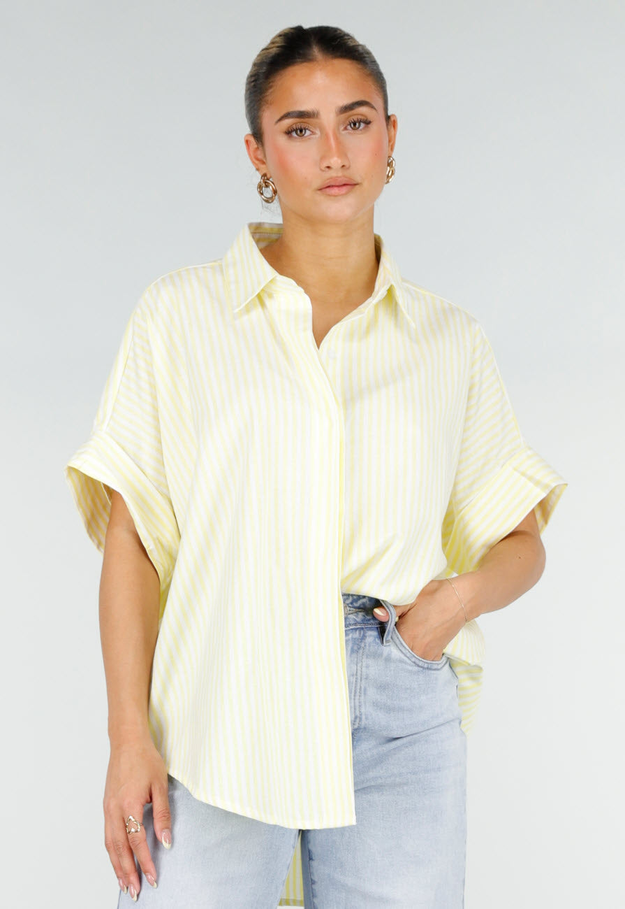 Bluse mit vertikalen Streifen in Hellgelb und Weiß. Mit Kragen, Knopfleiste und kurzen Ärmeln. Das Modell hat eine Oversize-Passform und einen längeren Rücken.