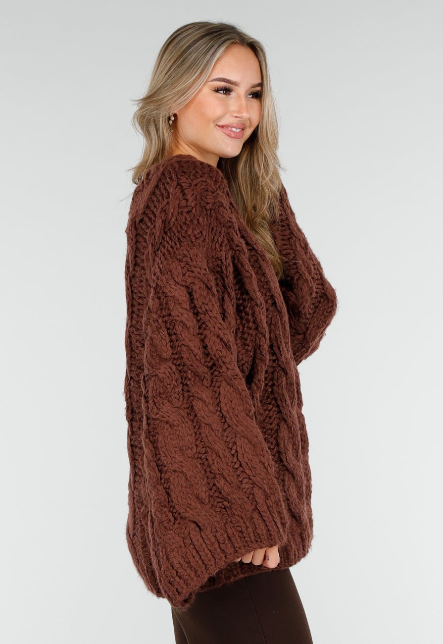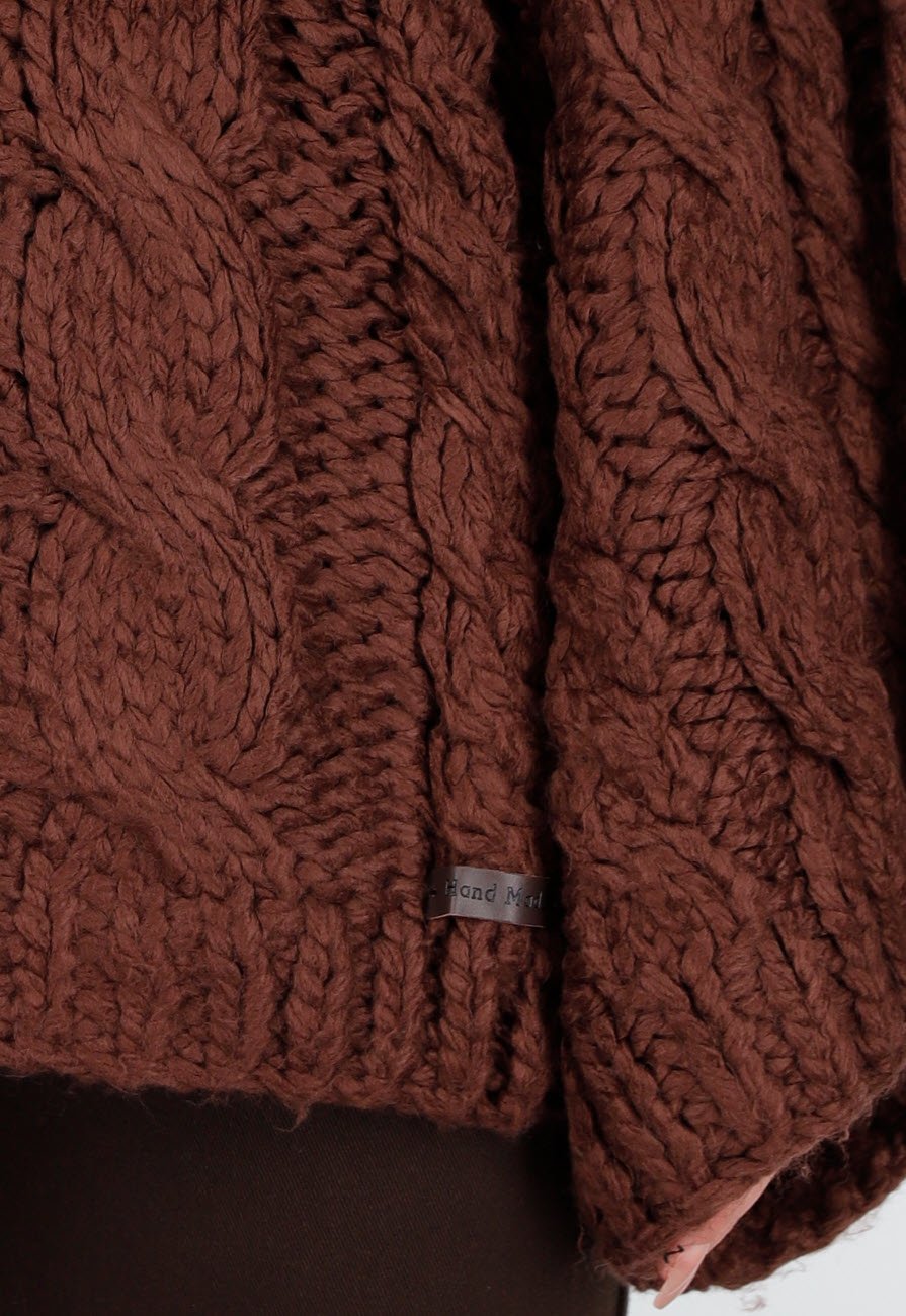 Dieser handgefertigte Pullover ist aus einem grob gestrickten Stoff in Dunkelbraun gefertigt. Das Modell hat einen Rundhalsausschnitt und ein auffälliges Zopfmuster auf der Vorder- und Rückseite. Die langen Ärmel sind extra weit und fallen locker über die Arme. Der Pullover hat eine gerade Passform mit einem Rippstrickbund am Saum und an den Ärmelbündchen. Die Länge reicht bis zur Hüfte.