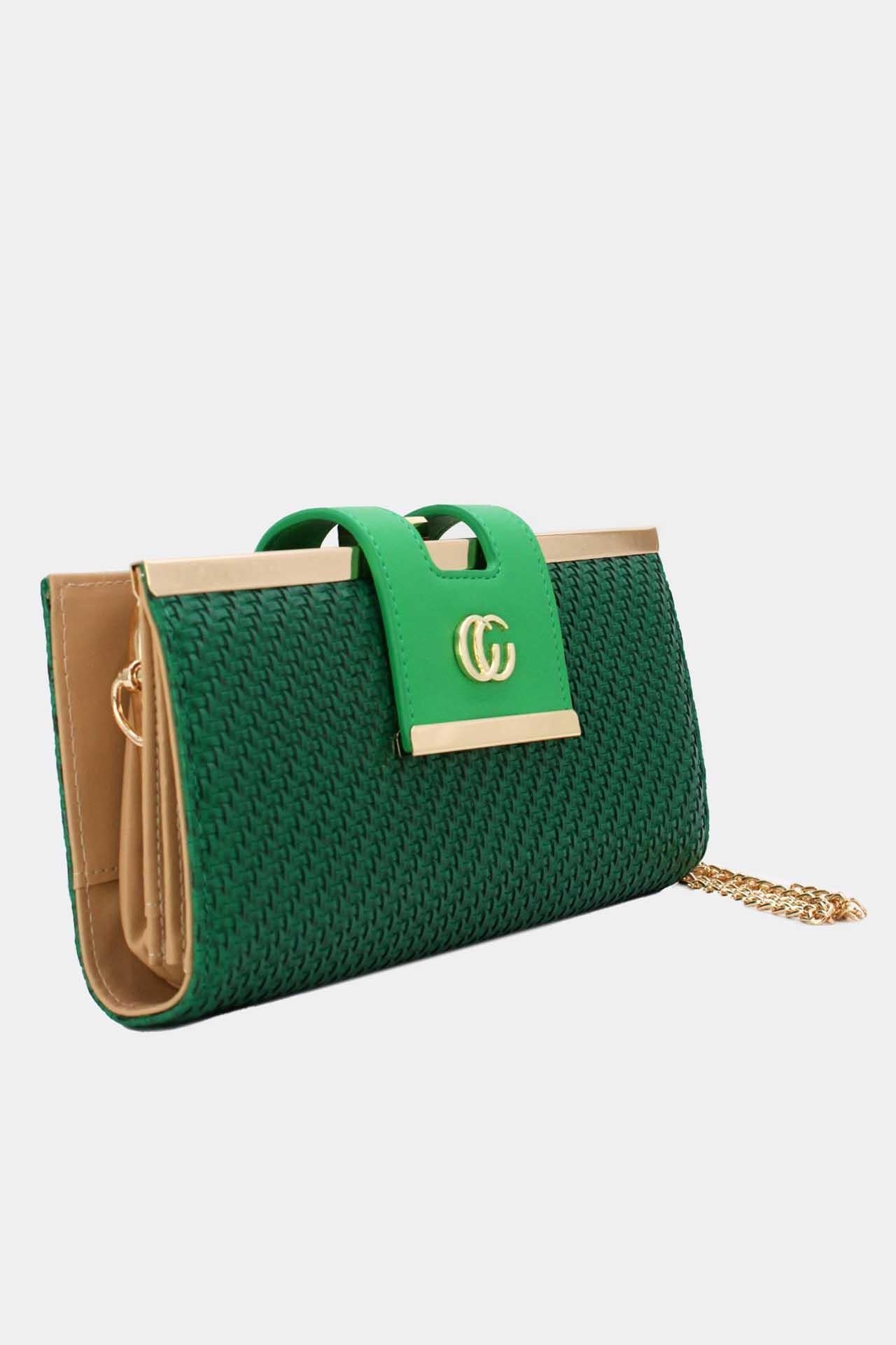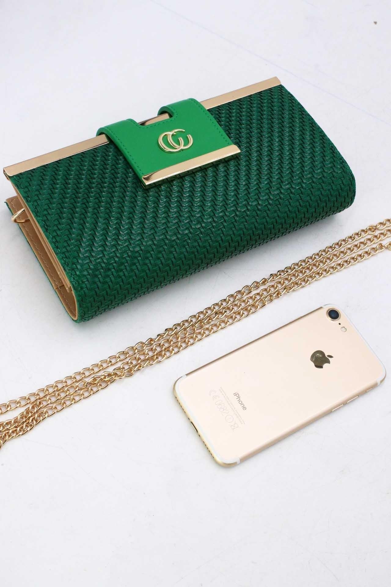Grüne Clutch mit goldener Kette