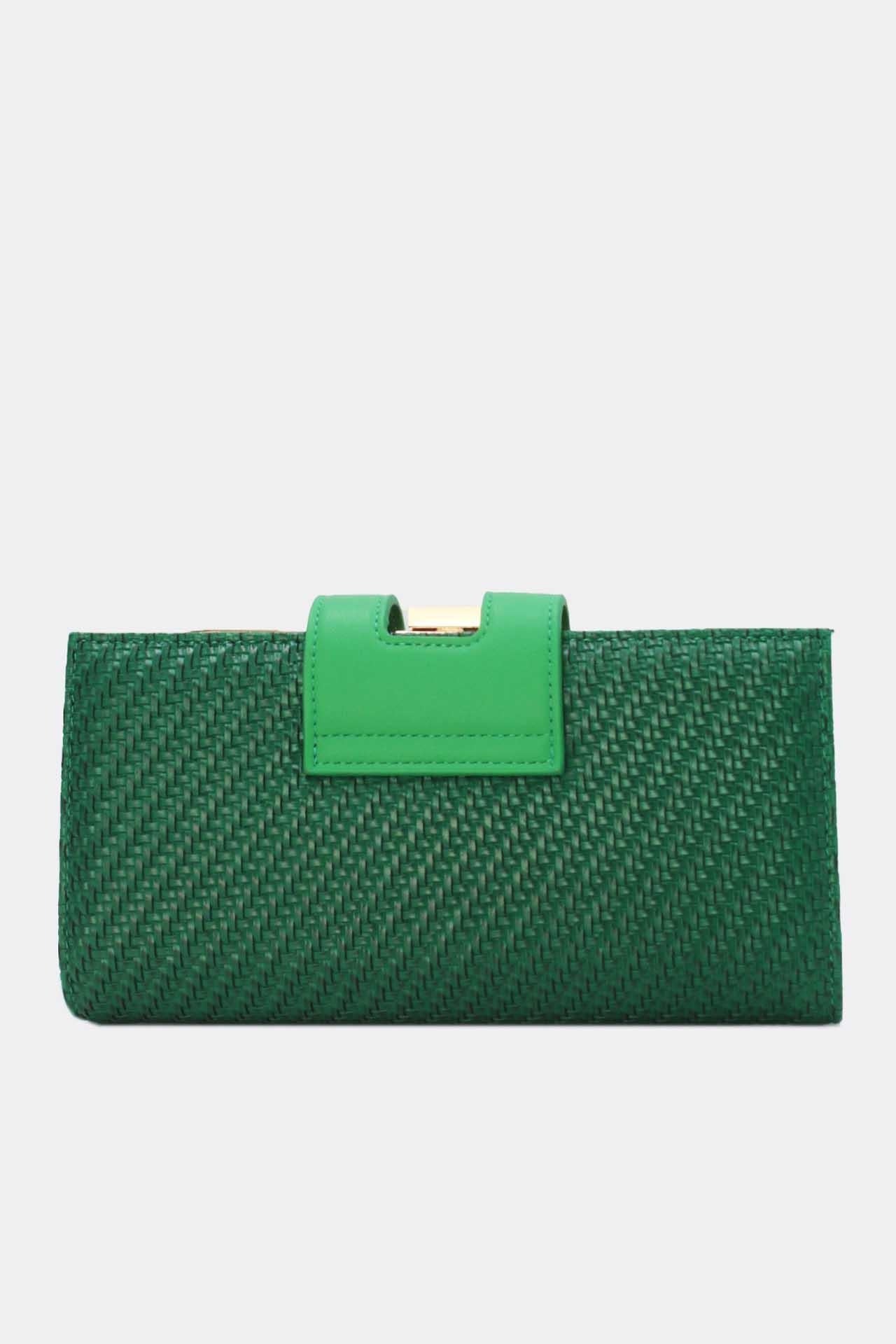 Diese grüne Clutch ist aus geflochtenem Kunstleder gefertigt und hat goldfarbene Details an den Rändern. Auf der Vorderseite befindet sich ein dekorativer Verschluss. Das Innere ist in einem Beigeton gehalten und bietet Platz für die wichtigsten Utensilien und verfügt sogar über ein Kartenfach. Zur Clutch gehört eine goldfarbene Schulterkette, sodass dieses Modell sowohl in der Hand als auch als Crossbody-Tasche getragen werden kann. Das Flechtmuster und die metallischen Akzente verleihen dieser Tasche einen modernen Look.
