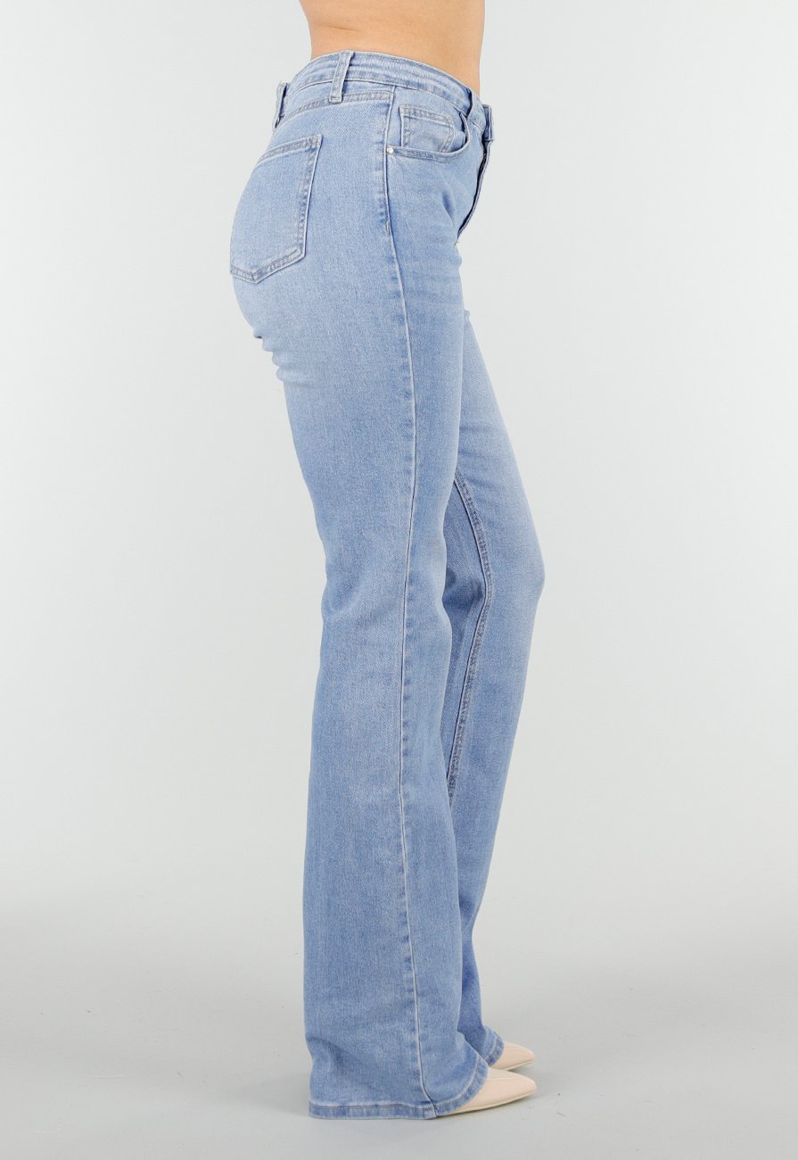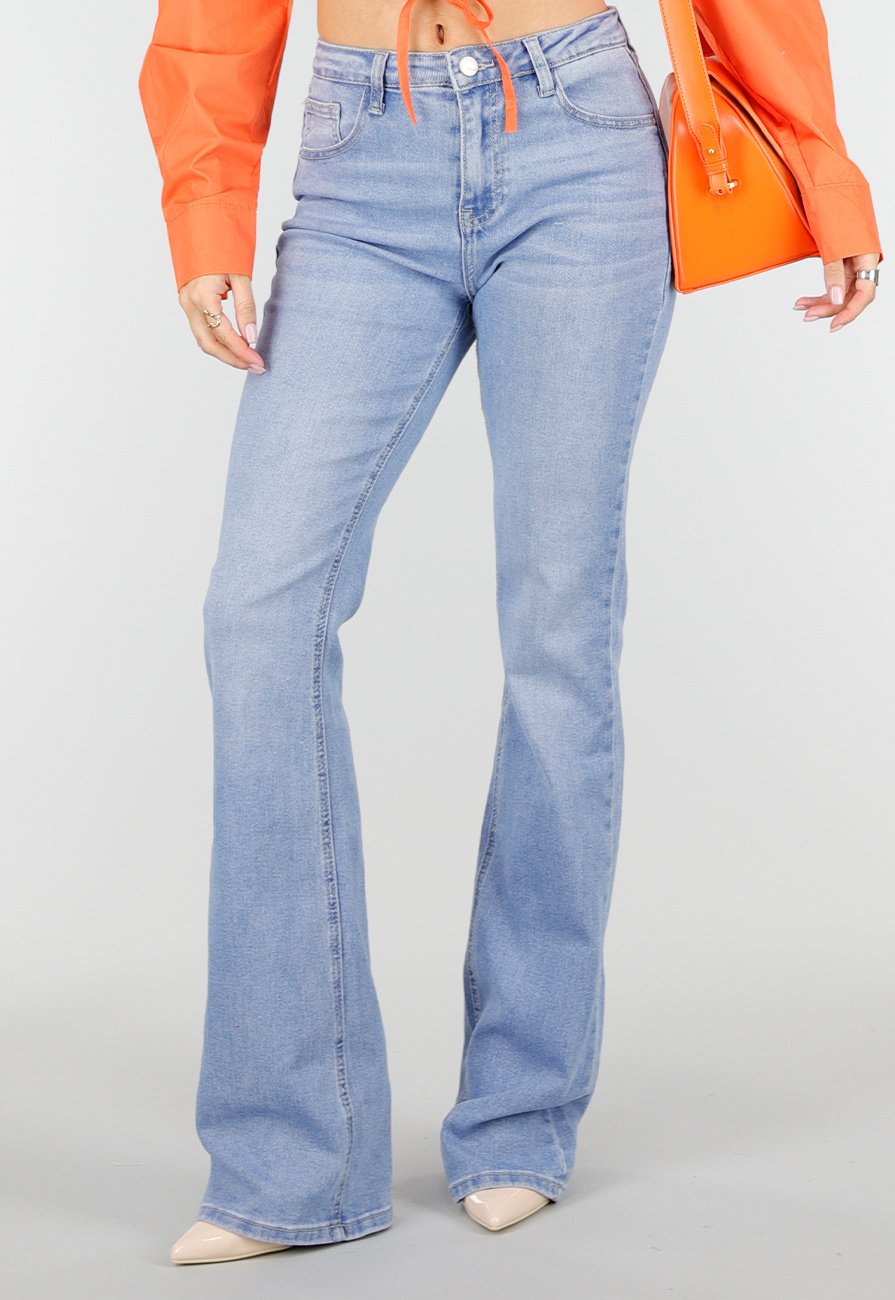 Hellblaue Jeans mit ausgestelltem Bein. Die Hose hat einen hohen Bund mit Gürtelschlaufen und wird mit einem Knopf- und Reißverschluss geschlossen. Sie verfügt über zwei Eingrifftaschen vorne und zwei Gesäßtaschen. Die Hosenbeine werden ab dem Knie weiter. Die Hose enthält Stretch.