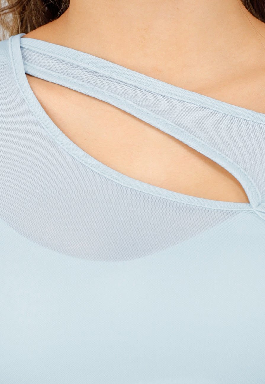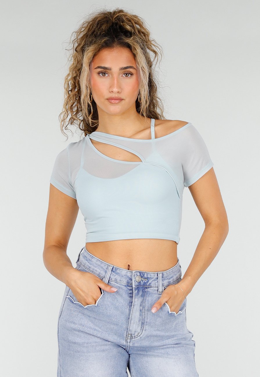 Hellblaues Crop-Top aus Mesh mit kurzen Ärmeln und Stretchmaterial. Das Top ist durchscheinend, verfügt jedoch über ein eng anliegendes Unterhemd mit Spaghettiträgern, sodass dieser Bereich nicht durchscheint. Das Modell hat einen asymmetrischen Ausschnitt mit Bändchenverzierung auf der Vorderseite und integrierten Polstern. Die Passform ist figurbetont.