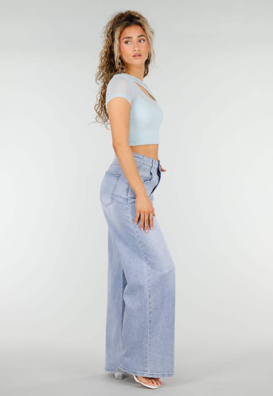 NEW250326 Lichtblauwe Mesh Crop Top met Korte Mouw Größe XS