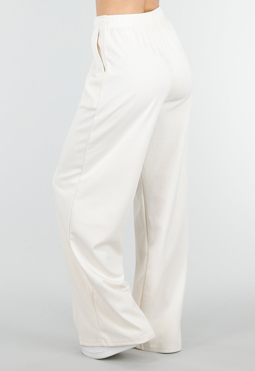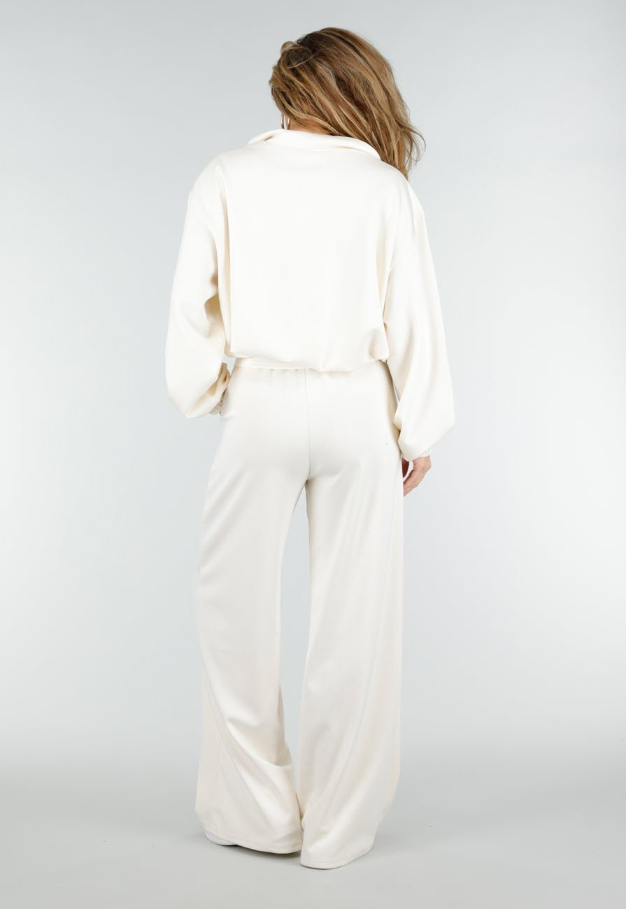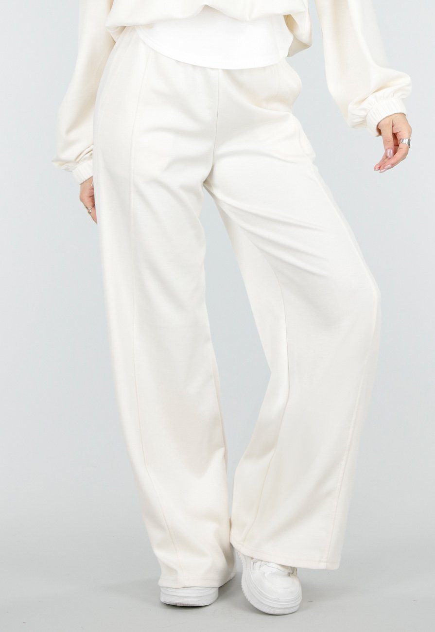 Crème joggingbroek met wijde rechte pijpen en een elastische tailleband. De broek is gemaakt van een zachte stof met stretch en heeft een losse pasvorm. De broek is voorzien van zakken.