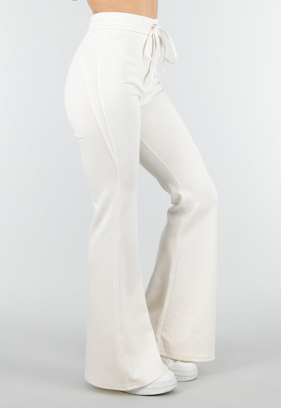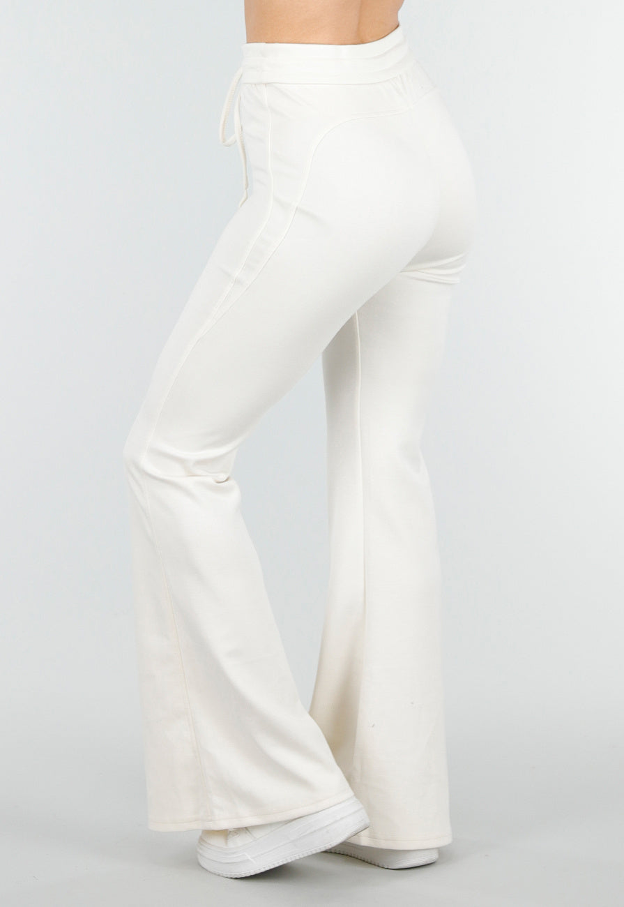 Beige joggingbroek met een aangesloten pasvorm en uitlopende pijpen. De broek heeft een elastische tailleband met strikkoord en bevat stretch voor extra comfort. De zachte stof geeft een casual en comfortabele uitstraling.