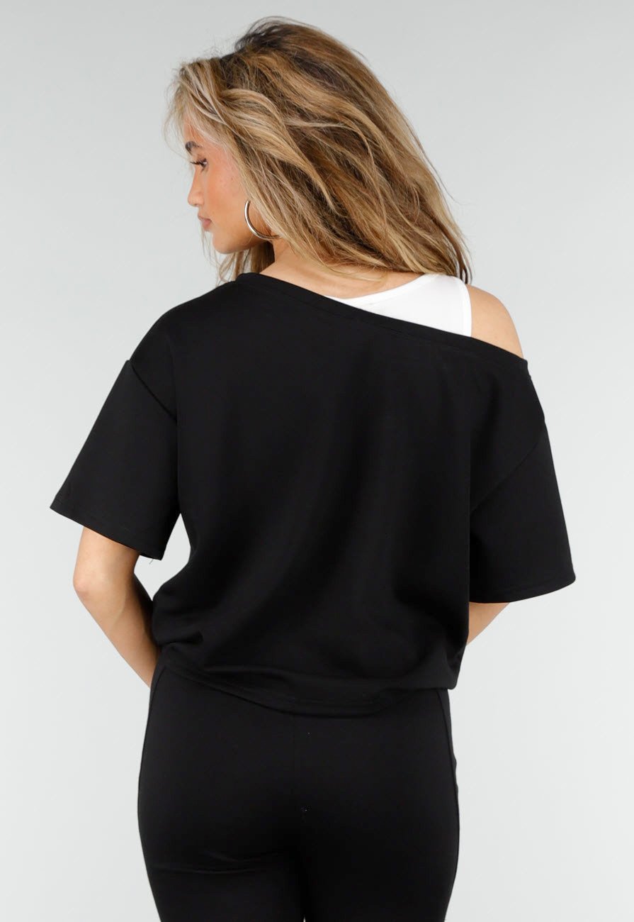 Zwarte top met een one shoulder design en een ingewerkte top voor extra comfort en bedekking. De top heeft een losse pasvorm met korte mouwen en valt soepel langs het lichaam. Gemaakt van een zachte stretch stof.