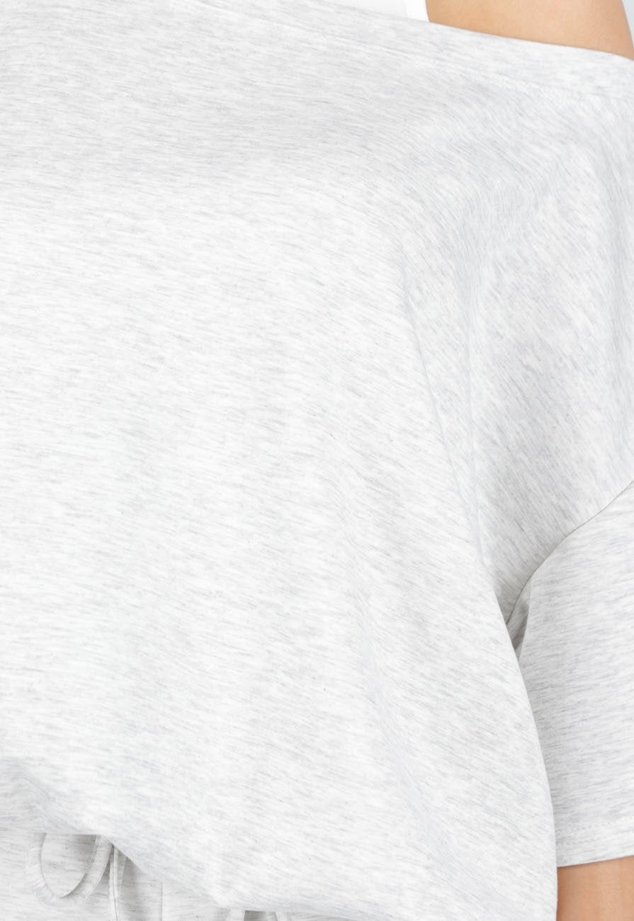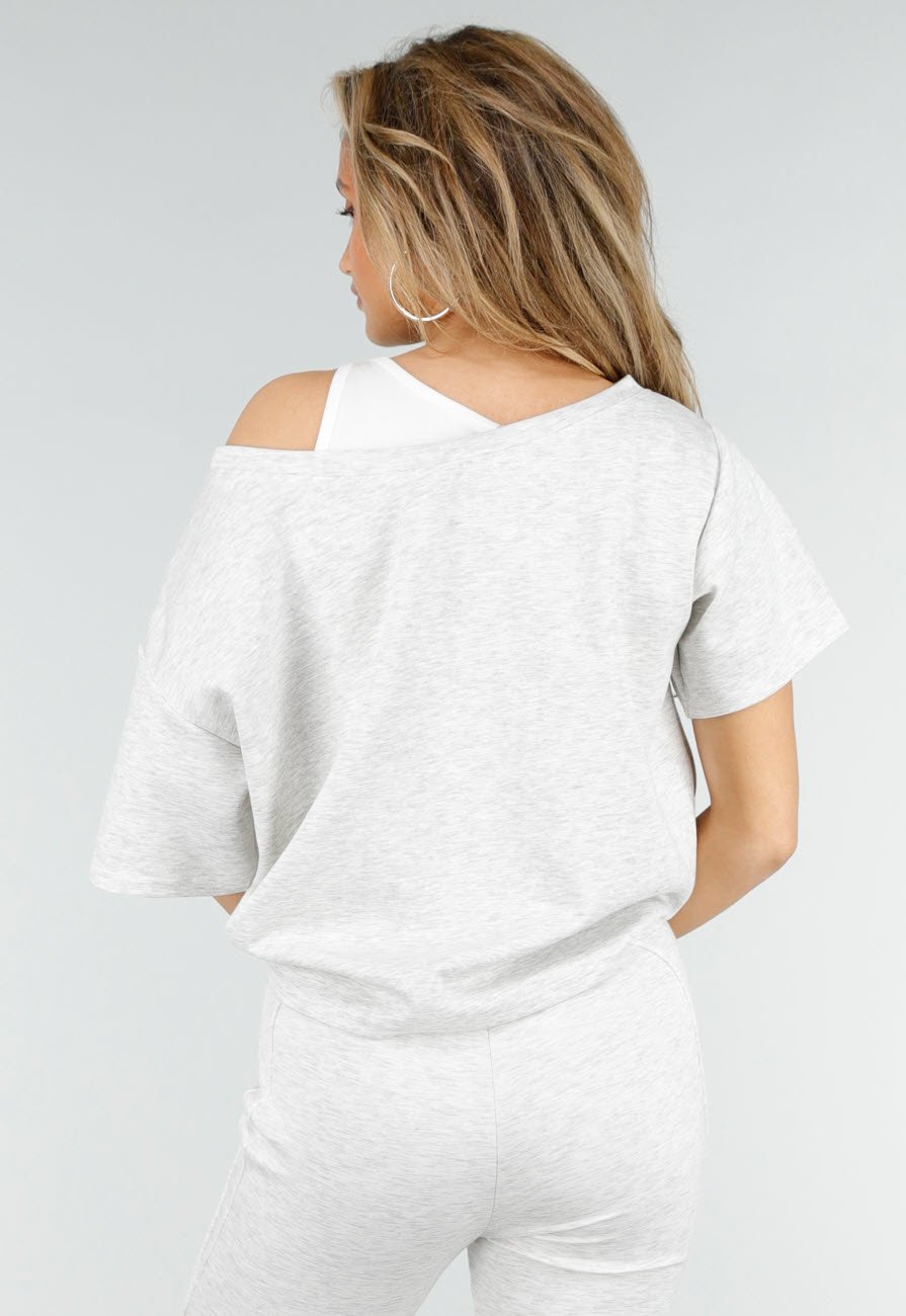 Grijze top met een one shoulder design en een ingewerkte top voor extra comfort en bedekking. De top heeft een losse pasvorm met korte mouwen en valt soepel langs het lichaam. Gemaakt van een zachte stretch stof.