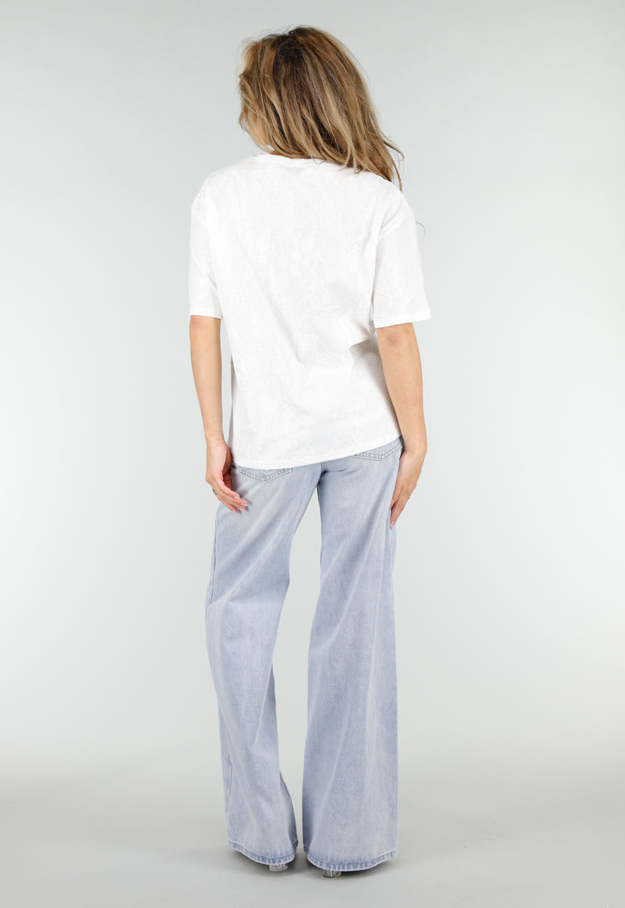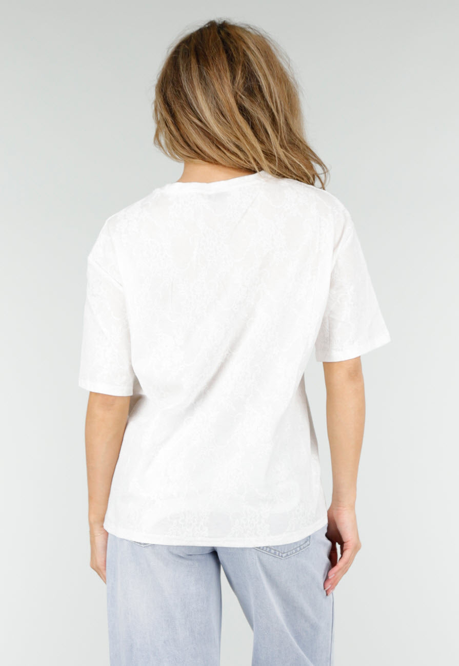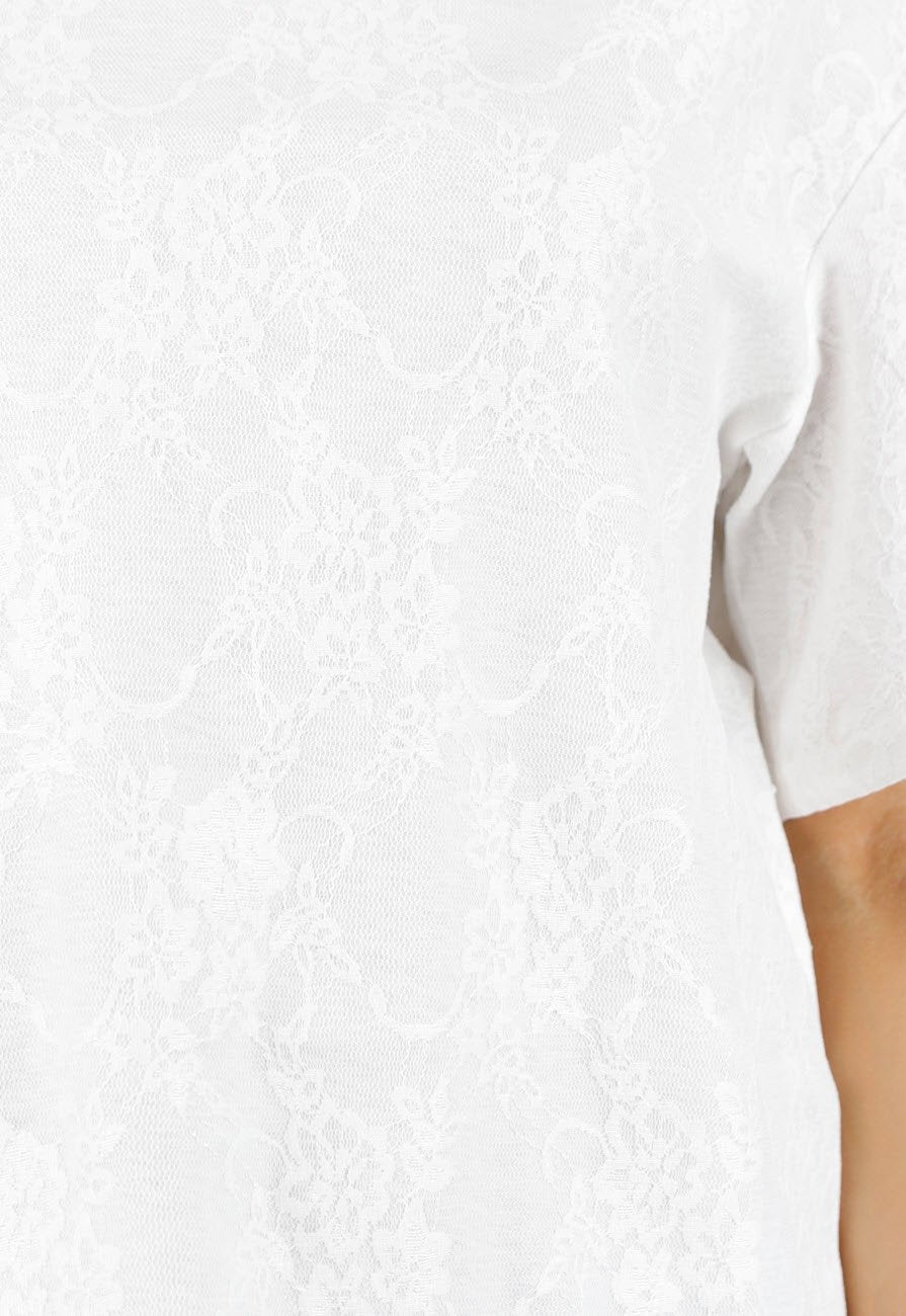 Wit T-shirt van kant met een rechte pasvorm. Het model heeft korte mouwen en een ronde halslijn. Het T-shirt valt losjes langs het lichaam en is gevoerd, waardoor het niet doorschijnend is.