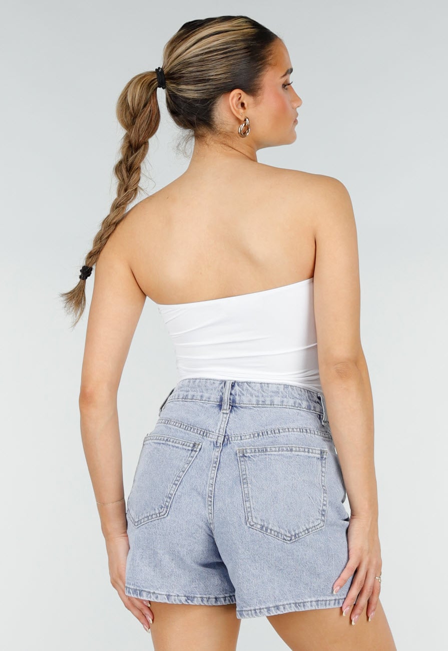 Weißes Bandeau-Top ohne Träger. Mit geradem Ausschnitt und figurbetonter Passform. Das Top enthält eingearbeitete Polster für zusätzlichen Halt. Hergestellt aus einem glatten, dehnbaren Stoff. Dank der integrierten Pads ist das Tragen eines BHs nicht notwendig.